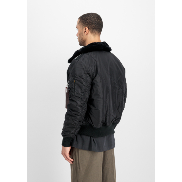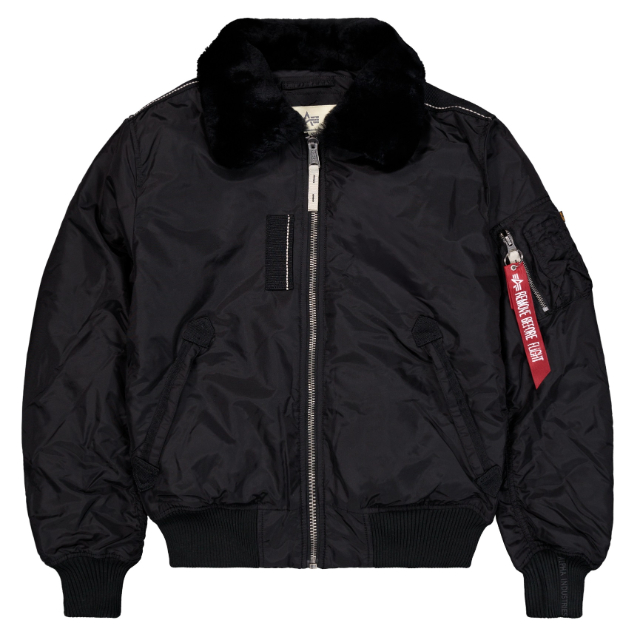 Het utility-zakje met Remove Before Flight-label op de mouw benadrukt de typische Alpha Industries-stijl.