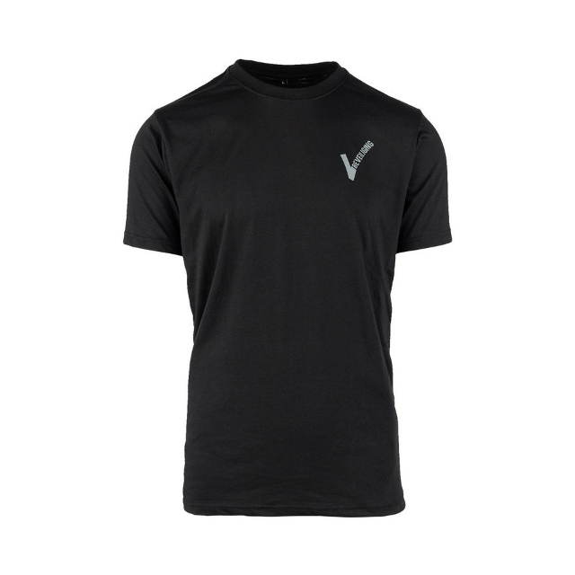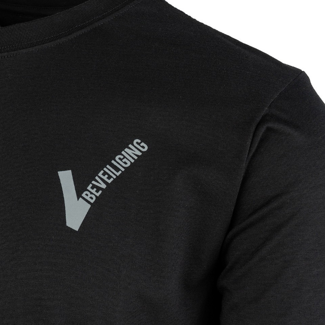 Op de voorkant van het T-shirt staat een v-logo waar het woord ‘beveiliging’ creatief in verwerkt is.