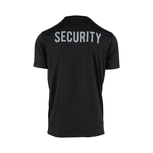 Op de achterkant van het T-shirt is het woord ‘security’ te zien.