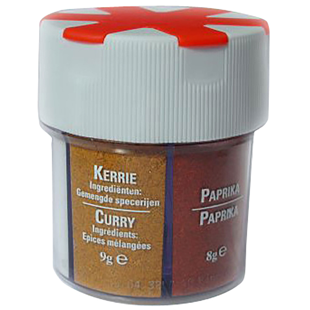 – Gemalen witte peper – Gemalen zwart peper – Tafelzout – Paprikapoeder – Currypoeder – Knoflook granulaat