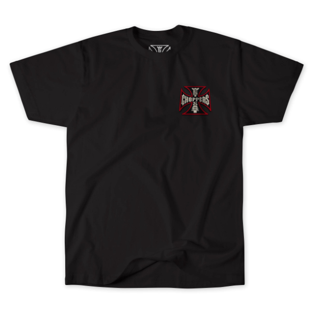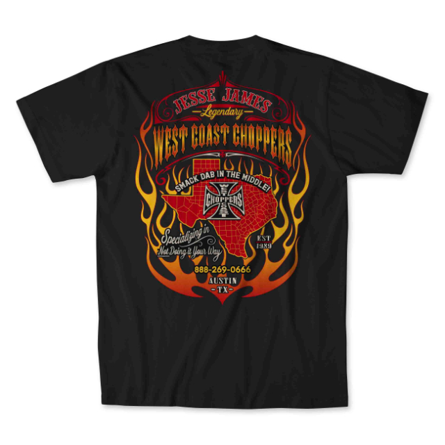 Aan de achterzijde grote Westcoast Choppers Jesse James Print.