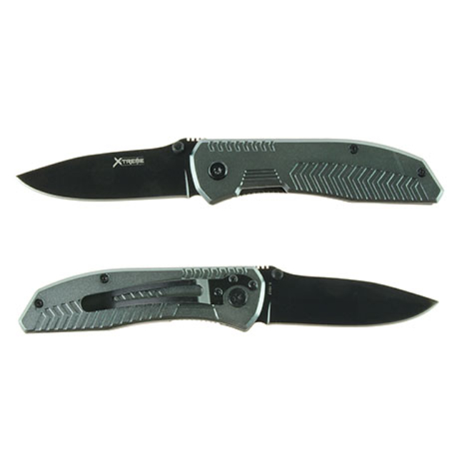De X-treme Grey Arrow is een simpel mesje met een zwart lemmet en een zilverkleurig aluminium beschaling.